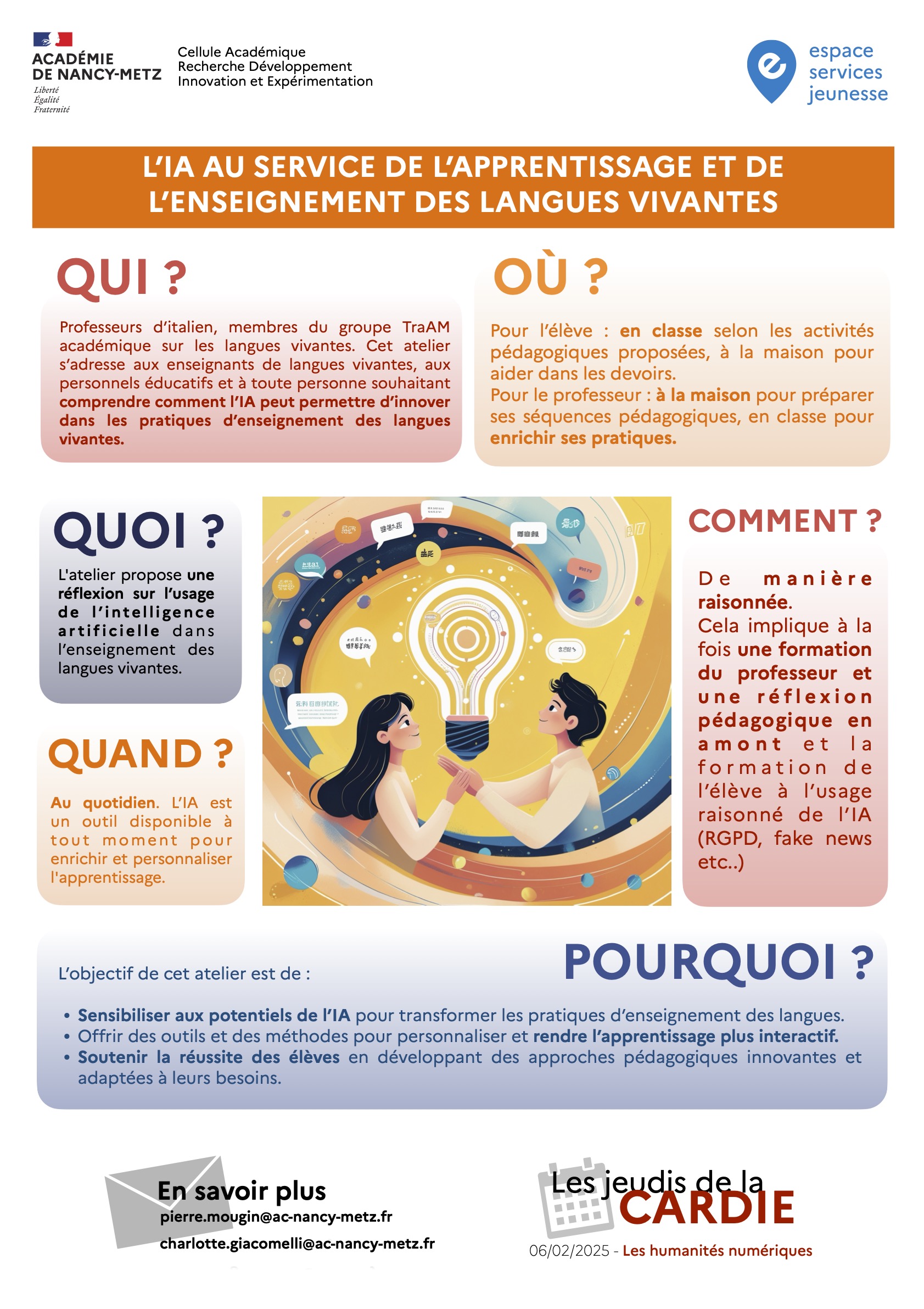 - Des ateliers en lien avec les projets et les actions académiques :