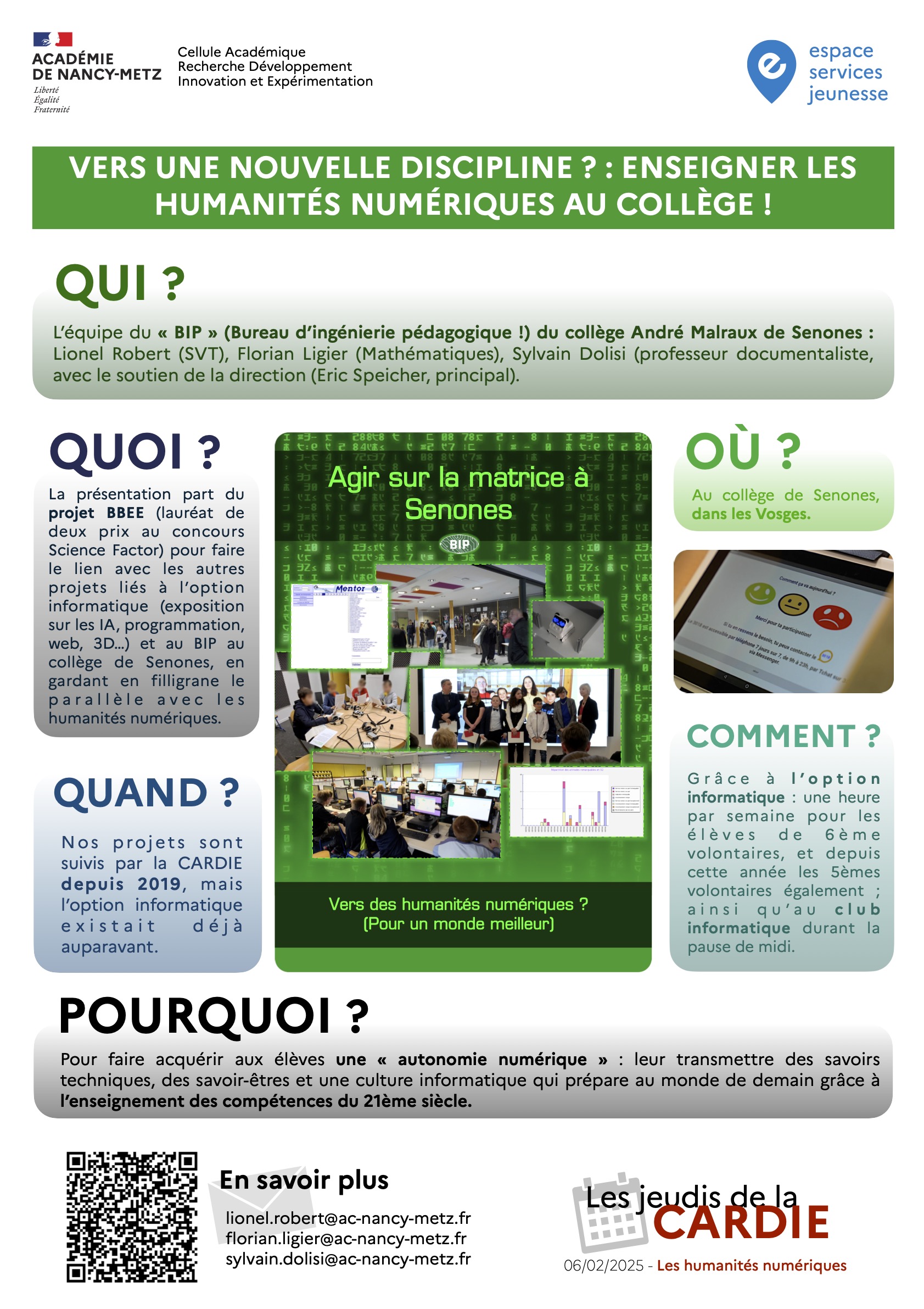 - Une conférence pour présenter la thématique de la journée : intervention introductive de Samuel Nowakowski, Maître de conférences HDR, Chercheur au LORIA, responsable licence infocom Nancy et responsable des Humanités Ecole des Mines de Nancy,