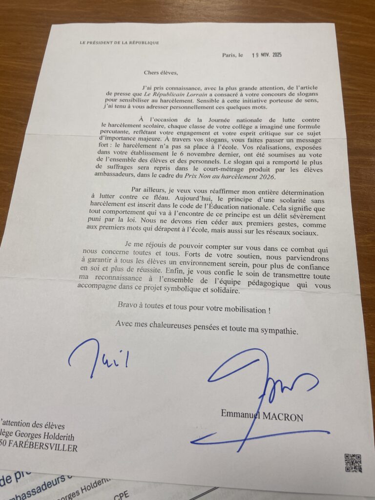Le collège Gorges Holderith agit d’ailleurs depuis plusieurs années : comme dans de nombreux établissements, des micro-violences à déplorer, perceptibles dès lors que les sanctions augmentent. Dans ce chemin de réflexion portant sur la bonne stratégie à déployer face à des tensions plus ou moins récurrentes, le personnel du collège s’est retroussé les manches. En 2023/24, déjà 10 ambassadeurs étaient désignés dans tout l’établissement : ce chiffre monte rapidement à un ambassadeur par classe, clairement mis en avant et identifié par leurs pairs, et qui plus est formé à la thématique du harcèlement. L’établissement se lance alors dans plusieurs concours, permettant de mobiliser plusieurs dizaines d’élèves sur des temps choisis : le concours « Un slogan par classe », en interne, puis la participation au concours NAH, avec une réalisation d’un court métrage à la clef. Parmi les autres actions d’envergure, la construction d’un arbre en bois, qui participe à inscrire dans l’espace cette lutte devenant quotidienne. Résultat : une labellisation au niveau 1 dans le programme pHARe pour la deuxième année consécutive, et petite cerise sur le gâteau, une médiatisation finement pensée qui aboutit à une surprise dans la boîte aux lettres, un matin de novembre 2025… Une lettre de félicitations du président de la République en personne.