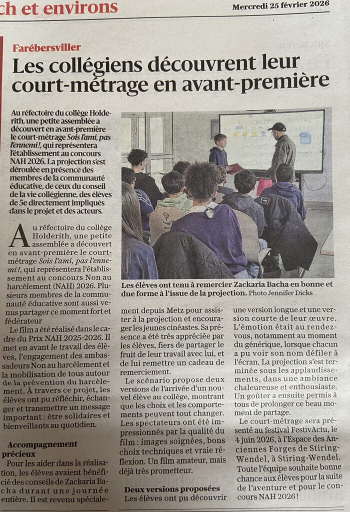 Depuis 2024, l’institution scolaire a pris à bras le corps la question du harcèlement pour en faire une cause nationale, qui convoque les efforts de tous les acteurs de l’école et qui se renforce dans le temps. On connaît maintenant l’acronyme NAH (Non au harcèlement) : sa journée du mois de novembre, son numéro de téléphone (le 3018), son concours… Cette articulation autour du programme pHARe a donné aussi son nom à un parcours dédié aux familles, et plus récemment, c’est le Safer Internet Day qui s’est greffé à ce plan ambitieux dans sa vision globalisante. Chaque établissement scolaire français est autonome dans l’organisation de ce programme, mais certains vont plus loin que les attentes, et tracent peut-être les lignes de demain : parmi eux, le collège Georges Holderith de Farébersviller en Moselle.